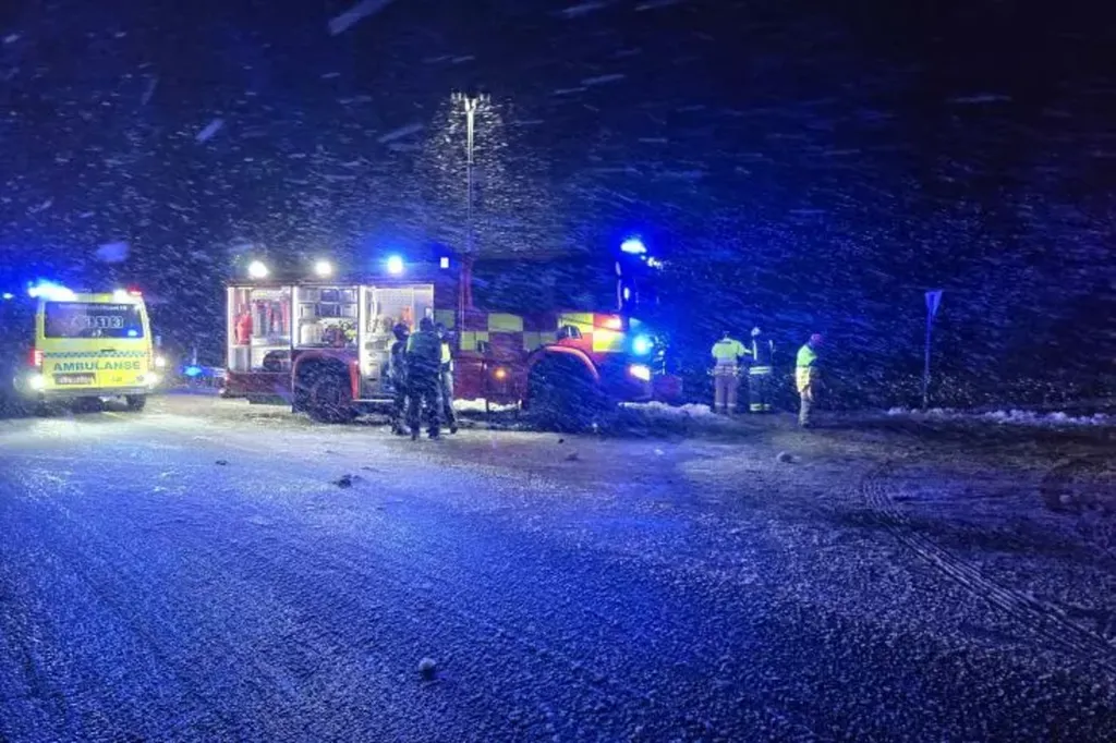 | Les services d'urgence interviennent près du lieu où un bus s'est renversé après avoir quitté la route dans un accident qui a tué trois personnes, près de Hadsel, en Norvège, le 26 décembre. |