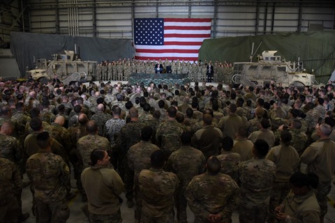 | Donald Trump fait une visite surprise aux troupes américaines sur la base de Bagram, en Afghanistan, le 28 novembre 2019. |