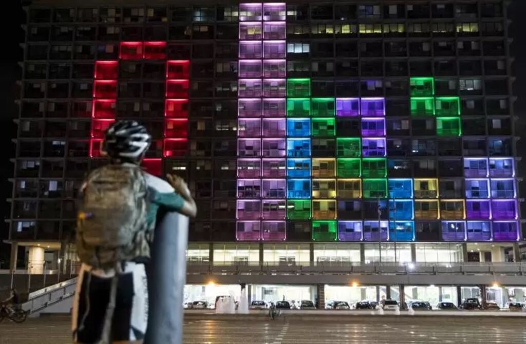 | Un enfant participe à un tournoi de Tetris géant en Israël, sur la façade d'un immeuble illuminé par plusieurs couleurs à Tel Aviv, le 30 août 2016. |
