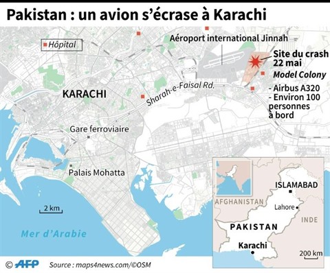 L'avion de la compagnie Pakistan International Airlines (PIA) s'est écrasé sur un groupe de maisons alors qu'il approchait de l'aéroport de Karachi. Le dernier bilan faisant état de 97 morts et deux survivants inclut tous les occupants de l'appareil, ont indiqué les services sanitaires de la province du Sindh, dont Karachi est la capitale. On ignore si la catastrophe a fait aussi des victimes au sol.