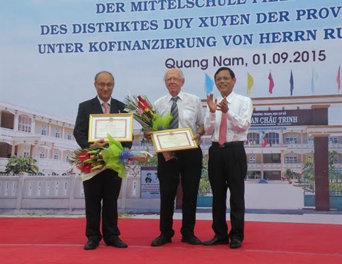 | L’Allemand Rudolf Walther (centre) lors de la cérémonie d’inauguration du collège Phan Châu Trinh. |