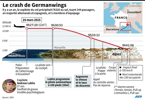 Le crash de l'avion de la Germanwings, avait provoqué la mort de 144 passagers et six membres d'équipage. L'enquête judiciaire en France, et celle du BEA avaient rapidement conduit à la mise en cause du copilote, qui souffrait de lourds problèmes psychologiques et qui avait profité de l'absence momentanée du pilote dans le cockpit pour commander la descente fatale une demi-heure après le décollage. Peu après, l'appareil s'écrasait sur le relief montagneux, se disloquant sous l'effet du choc.