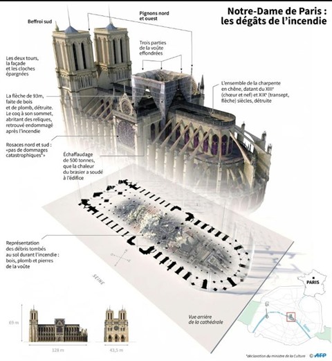 | Principaux dégâts de l'incendie de Notre-Dame de Paris. |