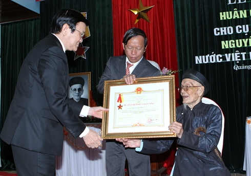 | Le président du Vietnam, Truong Tân Sang (gauche), a décerné, le 15 avril à Quang Nam (Centre), à titre posthume l'Ordre de l'étoile d'or à un représentant de la famille de Huynh Thuc Khang |