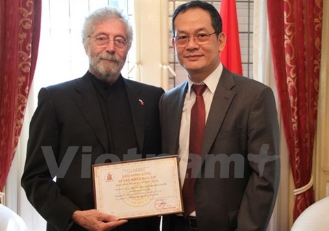 | L'ambassadeur du Vietnam en Argentine, Nguyên Dinh Thao (droite), et Oscar Alberto Goldadler, le 7 janvier à Buénos Aires. |