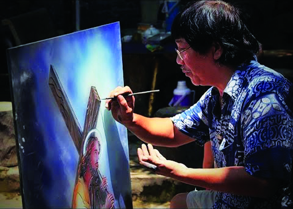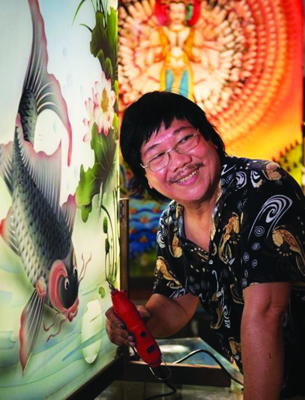 Son atelier à Son Tây, à 40 km de la capitale, regorge de centaines de vitraux et peintures sur verre, hautes en couleurs. À côté des œuvres inspirées de Dieu, des saints, de la Renaissance (1330-1630), ou de Pâques…, cet artisan talentueux réalise aussi des œuvres sur la culture traditionnelle du Vietnam, avec des représentations de dragons, de phénix, de lotus ou de la Cité impériale de Thang Long - Hanoï. Il souhaite mettre en lumière les identités vietnamiennes à travers ces œuvres colorées.