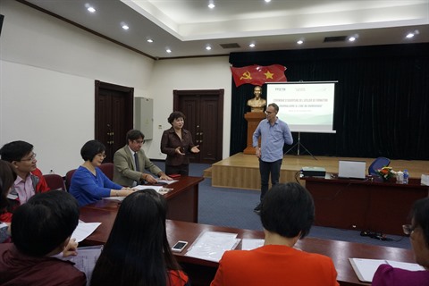 | La rédactrice en chef du Courrier du Vietnam, Nguyên Thu Hà (debout), et le formateur de l'atelier, Alain Mercier. |