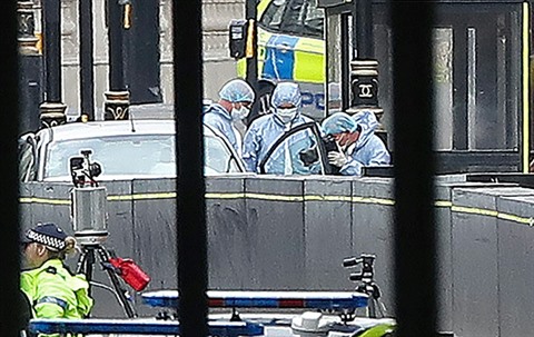 | La police scientifique devant le Parlement, le 14 août, où un homme a précipité sa voiture contre les barrières de sécurité. |