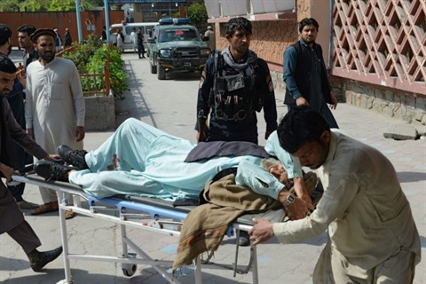 | Des volontaires afghans conduisent un homme à l'hôpital après une explosion à Jalalabad le 19 mars. |