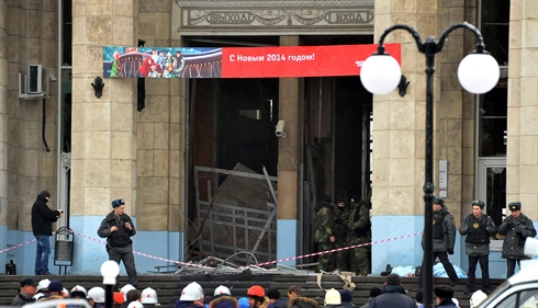 | Les forces de sécurité russes à l'extérieur de la gare de Volgograd après un attentat suicide, le 29 décembre |