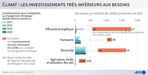 | Niveaux d'investissements nécessaires pour s'adapter au réchauffement climatique, en comparaison des investissements actuels, par secteur. |