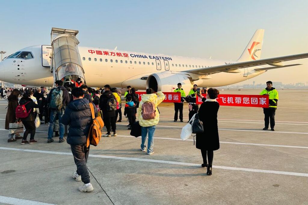 | Des passagers se préparent à monter à bord d'un avion C919 à l'aéroport international Hongqiao de Shanghai, dans l'Est de la Chine, le 26 janvier. |