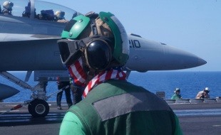 | Un chasseur américain s'apprête à décoller du porte-avion USS Harry S. Truman en Méditerranée orientale, le 7 juin 2016. |