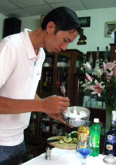 | Nguyên Hoàng Duc s’exerce chez lui à préparer un cocktail. |