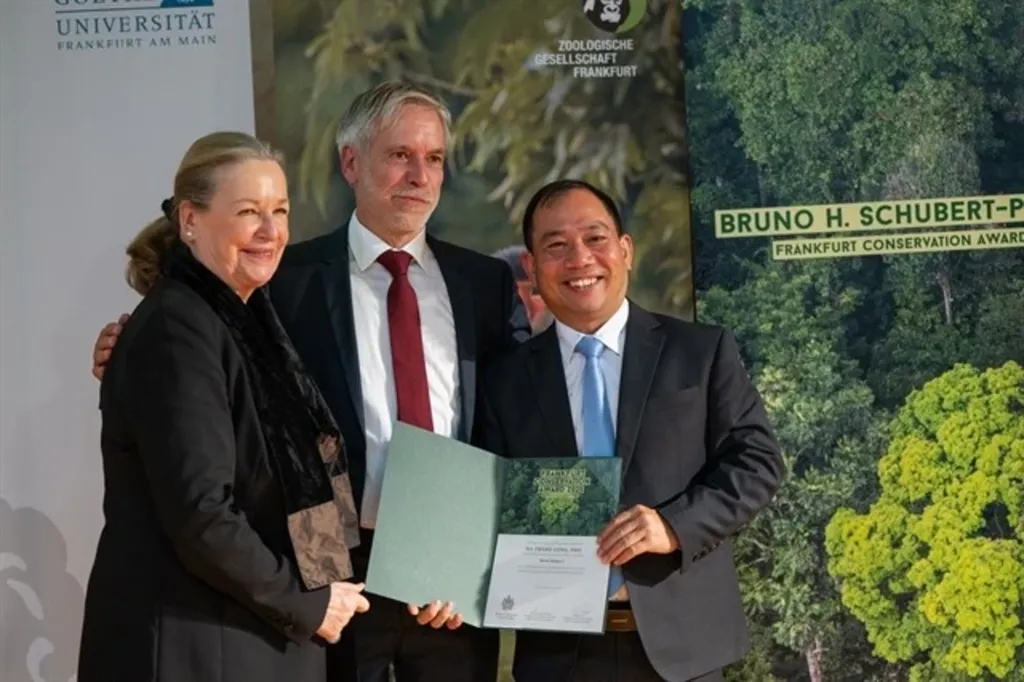 | Le Dr Hà Thang Long (première à droite), vice-président et directeur exécutif de Vietnam Conservation, reçoit le Prix de la conservation de Francfort (prix Bruno H. Schubert). |