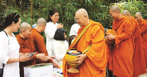 | Le bonze supérieur Thich Tuê Lâm (1er à droite) faisant l’aumône. |