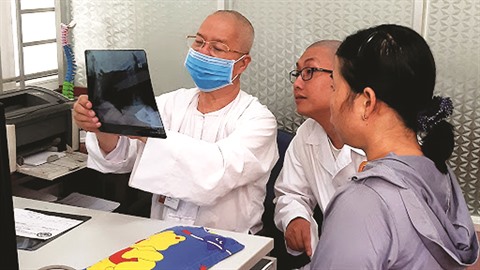 Vêtu d’une blouse blanche, le bonze supérieur Thich Tuê Lâm, gérant de la pagode de Phap Luân et directeur du Centre de médecine traditionnelle Tuê Tinh Duong Liên Hoa, s’affaire autour de ses patients. Consultations, préparation des remèdes, acupuncture…, ses journées sont bien remplies. "À vrai dire, les malades sans le sou ont plus besoin de médicaments et de soins que d’enseignements bouddhiques", a expliqué le bonze sexagénaire.