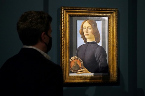| Le tableau Jeune homme tenant un médaillon de Sandro Botticelli présenté chez Sotheby's à New York. |