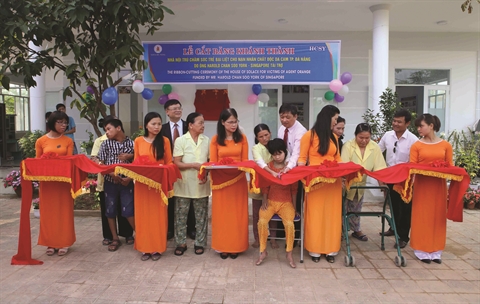 | Des jeunes, victimes de l’agent orange, coupent le ruban d’inauguration de la maison financée par Harold Chan Soo York . |