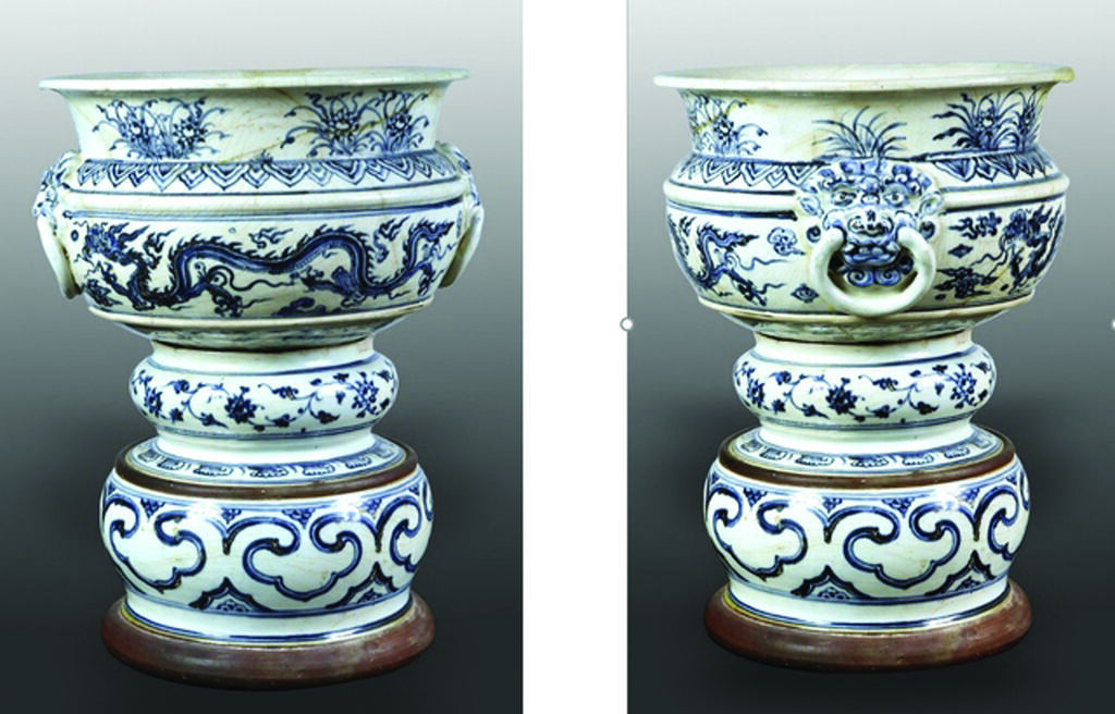 Pour fabriquer cet objet de 42,5 cm de hauteur, les anciens artisans ont dû modeler l’argile en deux parties. Après avoir terminé la sculpture, le séchage, la cuisson, ainsi que la décoration et la peinture, les deux parties ont été assemblées pour former une structure complète. La première partie, en forme de grand bol avec un large bord, est décorée de dragons et de fleurs. Il y a également deux jolis bas-reliefs de têtes de lion symétriques, ayant chacune un anneau dans la gueule. On y trouve aussi des motifs bleus représentant des orchidées, lotus, dragons, nuages et vagues.