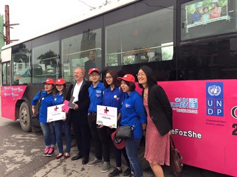 À bord du bus : la représentante en chef de l’ONU Femmes au Vietnam, Shoko Ishikawa ; l’ambassadeur du Canada au Vietnam, David Devine ; le conseiller du Programme des Nations unies pour le développement (PNUD), Jean Munro ; le directeur du Centre national du volontariat du Vietnam, Vu Minh Ly ; le président du Comité central de l’Union de la jeunesse du Vietnam, Nguyên Phi Long.