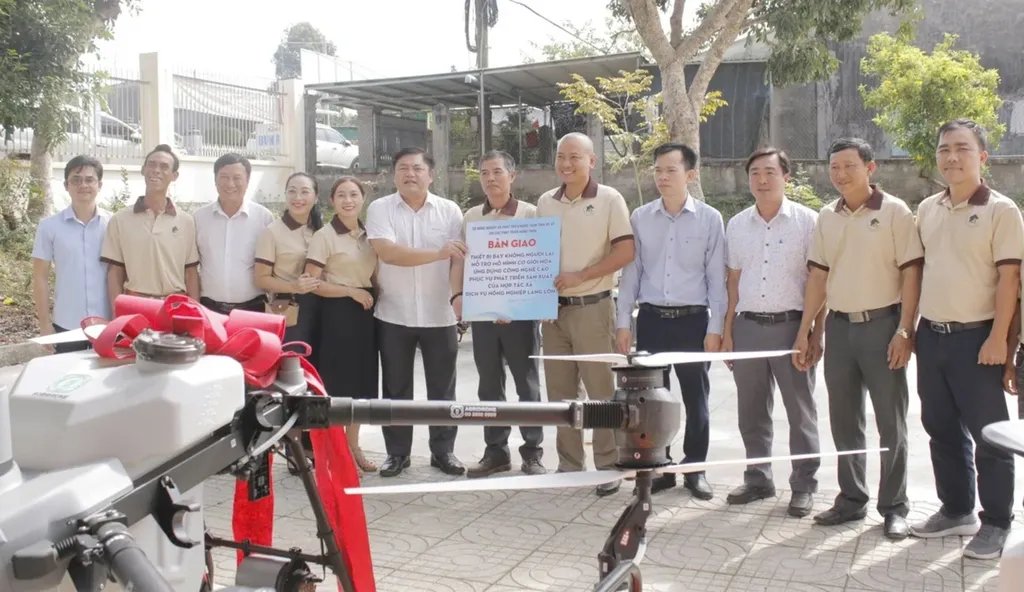 | Vũ Ngọc Đăng (chemise blanche) remet un drone à la coopérative Láng Lớn, dans le cadre de l’application de la Résolution 21. |