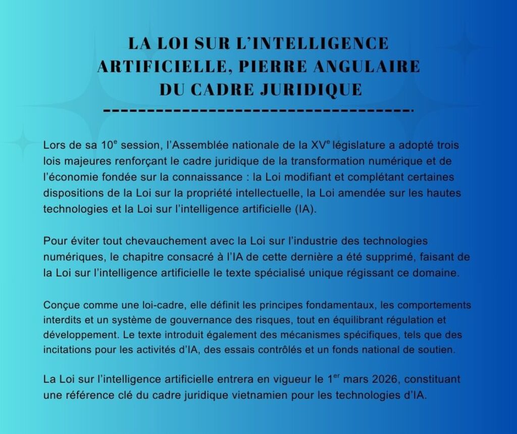 Composé de huit chapitres et de 48 articles, ce texte établit pour la première fois au Vietnam - et, selon certains observateurs, de manière inédite à l’échelle mondiale - un cadre juridique global pour l’espace numérique national. Il définit de manière systémique les concepts, principes, responsabilités et mécanismes de gouvernance de cet univers connecté.