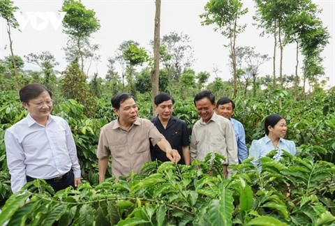 | Le ministre de l’Agriculture et de Développement rural, Nguyên Xuân Cuong, (2e, gauche) visite un jardin de café dans le district de Cu Mgar, province de Dak Lak |