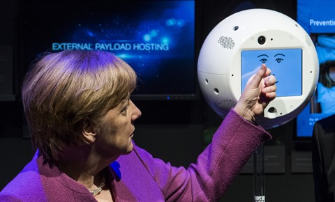 | La chancelière allemande Angela Merkel avec le robot CIMON, le 25 avril à Berlin. |