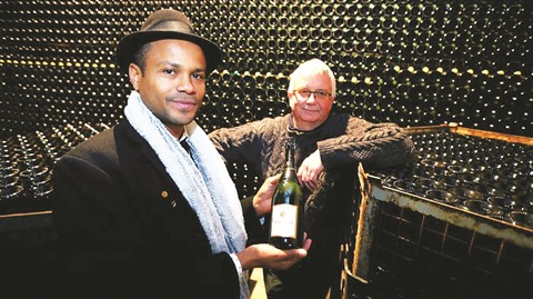 | Dian Diallo (gauche), qui a lancé un champagne à son nom, pose avec son associé, le vigneron Rémi Jacques, en Champagne, à Baye (France). |