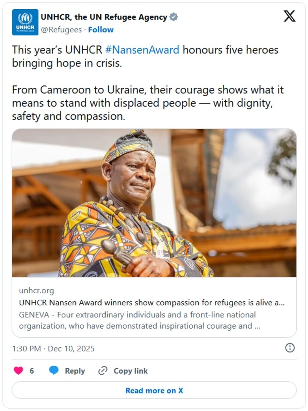 "Son leadership a transformé un petit village en un symbole de solidarité, reposant sur la conviction que ceux qui arrivent en détresse méritent d'être soutenus et de bénéficier d’un espace pour souffler", relève le HCR.