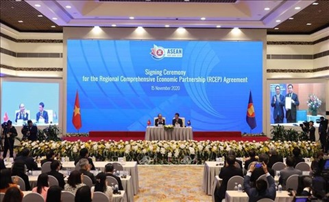 | Lors de la cérémonie de signature de l'Accord de partenariat régional économique global (RCEP). |