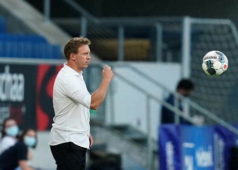 | L'entraîneur de Leipzig, Julian Nagelsmann, lors du match de Bundesliga contre Hoffenheim, à Sinsheim, le 12 juin. |