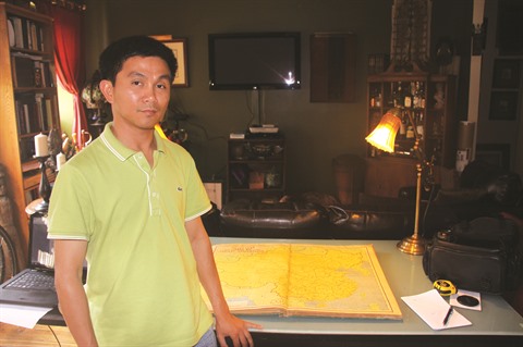 | Thang Trân à côté d’une ancienne carte faisant partie de sa collection. |