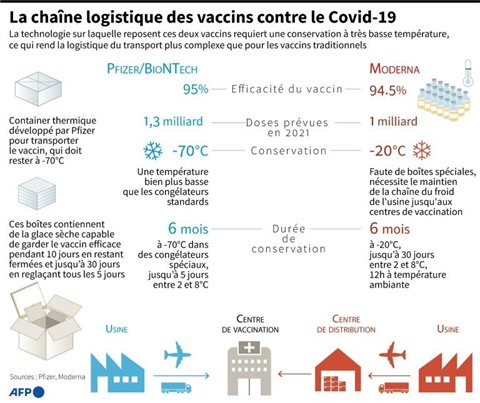 | Schéma sur l’acheminement des vaccins contre le coronavirus de Pfizer et Moderna en fonction de leur mode de conservation. |
