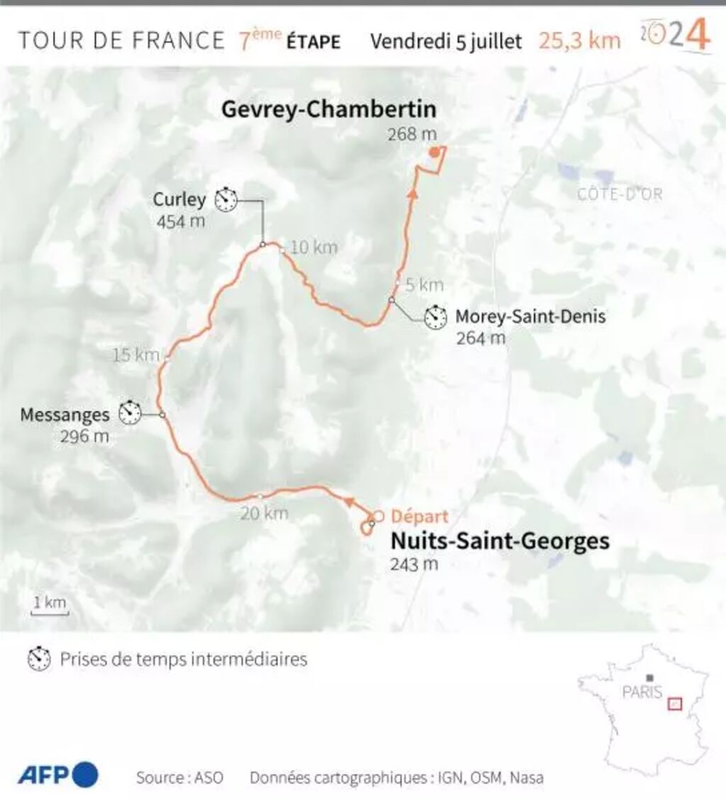 | Carte de l'étape 7 du Tour de France le 5 juillet entre Nuits-Saint-Georges et Gevrey-Chambertin (contre-la-montre individuel). |