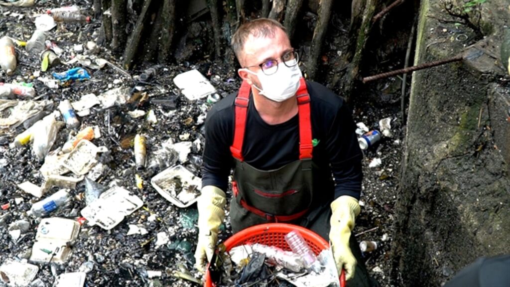 | Le volontaire lituanien Arturas ramasse des ordures dans un canal à Hô Chi Minh-Ville. |