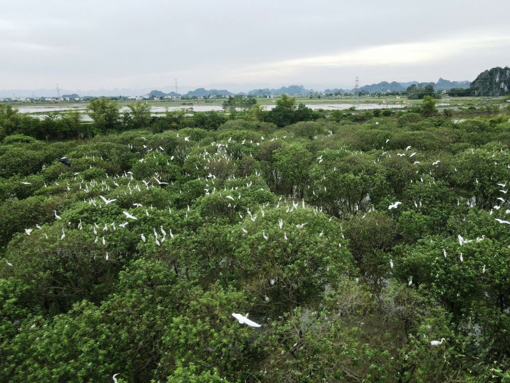 En période de crue, lorsque le niveau de la rivière s’élève, le nombre de braconniers diminue, note M. Lâm. Depuis fin 2015, des milliers de cigognes, principalement des hérons et des garde-bœufs, se sont établies dans la région. Elles se nourrissent le jour et reviennent au crépuscule. Pendant la saison de reproduction, de novembre à avril, elles nichent en grappes denses dans les arbres. Lorsque ceux-ci perdent leurs feuilles, l’endroit se pare d’un blanc éclatant, entièrement recouvert de cigognes.