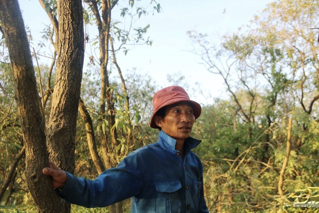 | Pendant la saison de nidification, M. Lâm patrouille régulièrement, ramassant les œufs ou les oisillons tombés au sol pour les remettre dans leurs nids. |