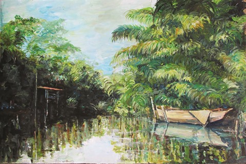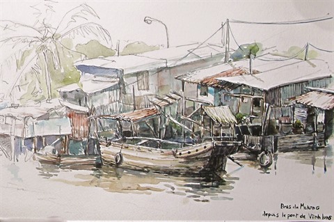 Notre artiste n’a pas de mots assez forts pour décrire tout ce qu’il a observé, ce qu’il a senti comme "une dérive silencieuse sur les rives du fleuve mythique, carnet de voyage entre terre et eau, entre imaginaire et réalité" ou encore "les tribulations d’un +Tây ba lô+ (Un Occidental voyageant avec un sac à dos) sur les rives du fleuve aux neufs dragons".
