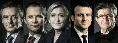 | De gauche à droite : François Fillon, Benoît Hamon, Marine Le Pen, Emmanuel Macron, Jean-Luc Mélenchon. |