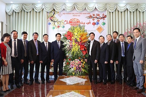 | Le président du Comité populaire municipal de Hanoï, Nguyên Duc Chung (6e à gauche) rend visite le 1er février à l'Église évangélique du Vietnam au Nord. |