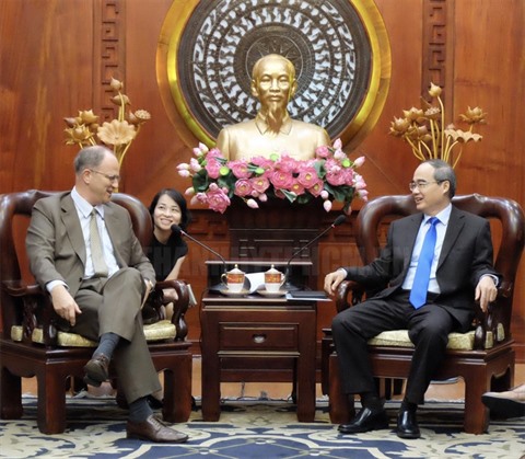 | Le secrétaire du Comité municipal du Parti de Hô Chi Minh-Ville, Nguyên Thiên Nhân (droite), et l'ambassadeur allemand Christian Berger, le 19 juin. |