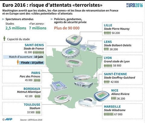 De sources policières, cinq matches du premier tour feront l'objet d'une vigilance renforcée : Angleterre - Russie (le 11 juin à Marseille), Turquie - Croatie (le 12 à Paris), Allemagne - Pologne (le 16 au Stade de France), Angleterre - Pays de Galles (le 16 à Lens) et Ukraine - Pologne (le 21 juin à Marseille).