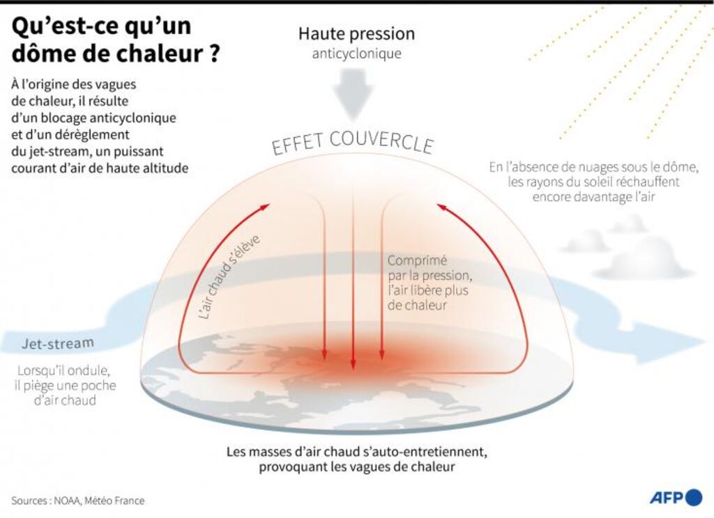 | Graphique expliquant le fonctionnement du "dôme de chaleur", qui entraîne des vagues de chaleur. |