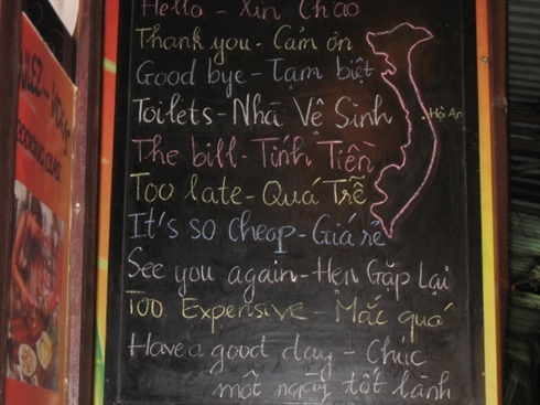 À l'extérieur de la bâtisse, rien d’exceptionnel. Des menus affichés sur l’ardoise et quelques tables en terrasse. Mais en regardant de plus près, l’on aperçoit un tableau où sont écrits les mots usuels, termes courants, expressions et phrases simples en français, en anglais, puis leur traduction en vietnamien. Ou l'inverse, c’est selon… «Le personnel du restaurant et moi donnons ici des cours de langues gratuits. Notamment de français pour les habitants de Hôi An et de vietnamien pour les touristes étrangers de passage», explique M. Denis, le patron, d'une authentique gentillesse.