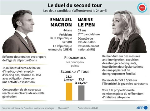 | Infographie sur le duel entre Emmanuel Macron et Marine Le Pen, qui seront opposés au second tour de l'élection présidentielle française le 24 avril. |