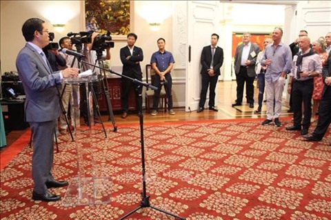 | L'ambassadeur adjoint du Vietnam aux États-Unis Pham Hung Tam prend la parole devant les membres du NFI. |