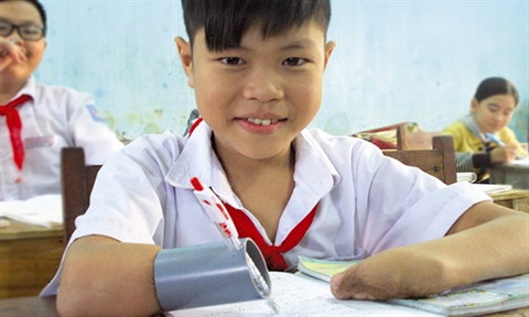 Après plus d’un mois d’exercice, il commence à écrire. «Avec le tube, je peux écrire et même dessiner», raconte Hiêu. En septembre 2014, il retrouve sa classe au Collège Nguyên Trai.