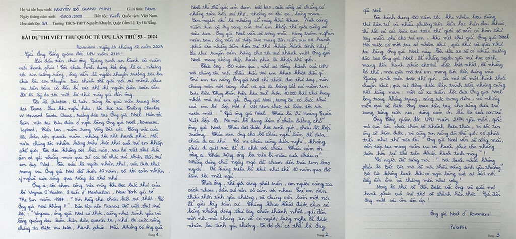 "J’ai écrit une lettre à envoyer au directeur général de l’UPU 150 ans plus tard avec l’espoir qu’il maintienne toujours l’activité de lecture des lettres envoyées par les enfants du monde entier, apportant ainsi du bonheur aux enfants", a fait savoir Nguyên Dô Quang Minh, de l’école secondaire et lycée Nguyên Khuyên.